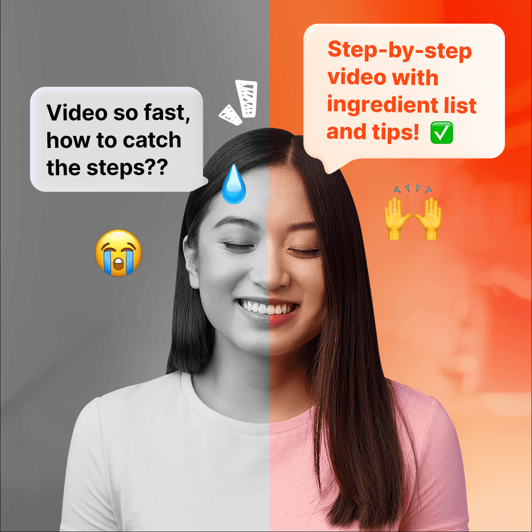 Jessica loves watching quick cooking and pilates videos on IG but never follows through. When she finally tries, she’s stuck pausing every few seconds to catch each step. and the videos often miss crucial details, like the best way to perform certain tasks.