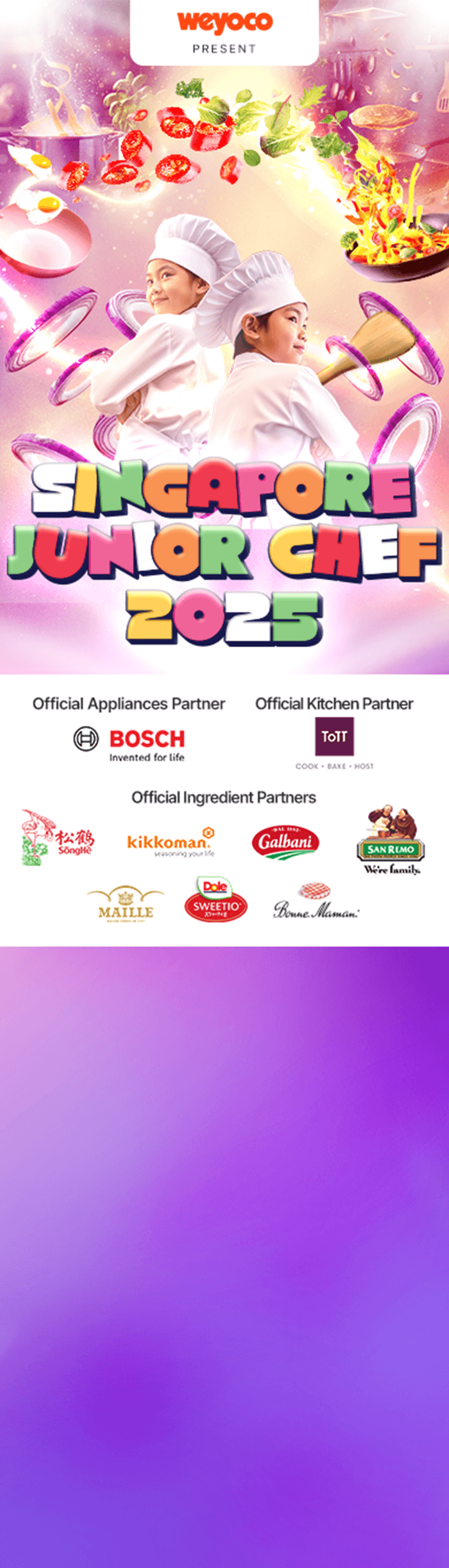 Singapore Junior Chef is Singapore’s first and largest hybrid kids’ culinary competition, now in its 4th edition. The event brings together online nominations, interactive workshops led by chefs, and exciting live cook-offs. With a mission to spark young people’s interest in the kitchen through hands-on opportunities to learn, create, and share, the competition also partners with leading family-friendly brands to help families discover the joy and confidence of cooking together at home. Since its launch, Singapore Junior Chef has engaged hundreds of families each year, generating over 1 million yearly impressions and establishing itself as a key event for inspiring the next generation of home cooks in Singapore.
